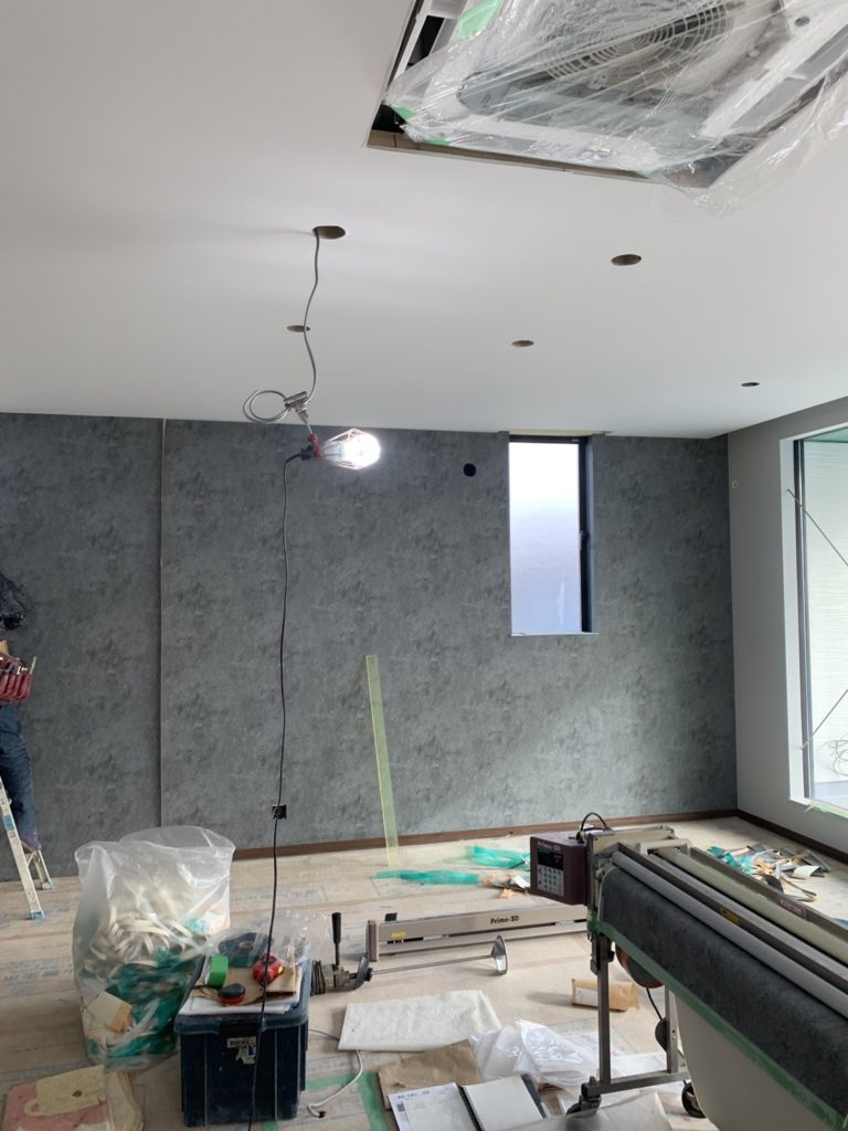 2階の住宅部分のクロス張りが始まりました。 冒険を色々と試みた、遊び心がある住宅です。