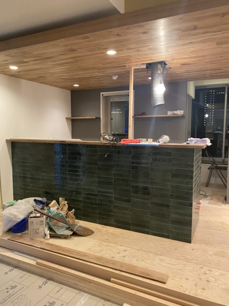 本日はタイル工事でした。 名古屋モザイクタイルさんのクロジョーロ。 クライアント様もとても楽しみにされていたものです。 タイルならではの高級感かつ美しさが感じ取られます。 クライアント様と共有した空間が仕上がっていくこと…