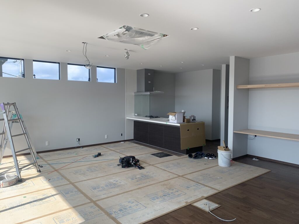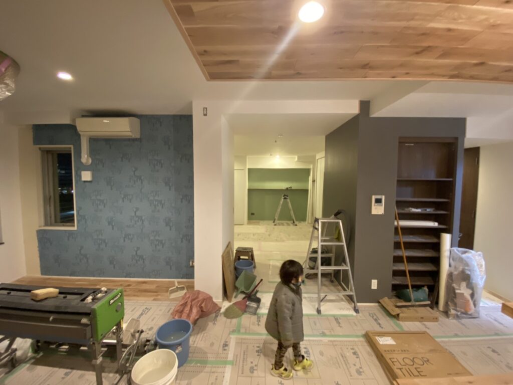 内装工事も大詰めです。 収納たっぷりのシンプルな白の空間! 収納で空間を上手に仕切っていて、収納が目立つのではなく、本やPC、子ども机等の生活の様子が目立つよう心掛けました。 また、空間があまり冷たくならないよう、木の色…