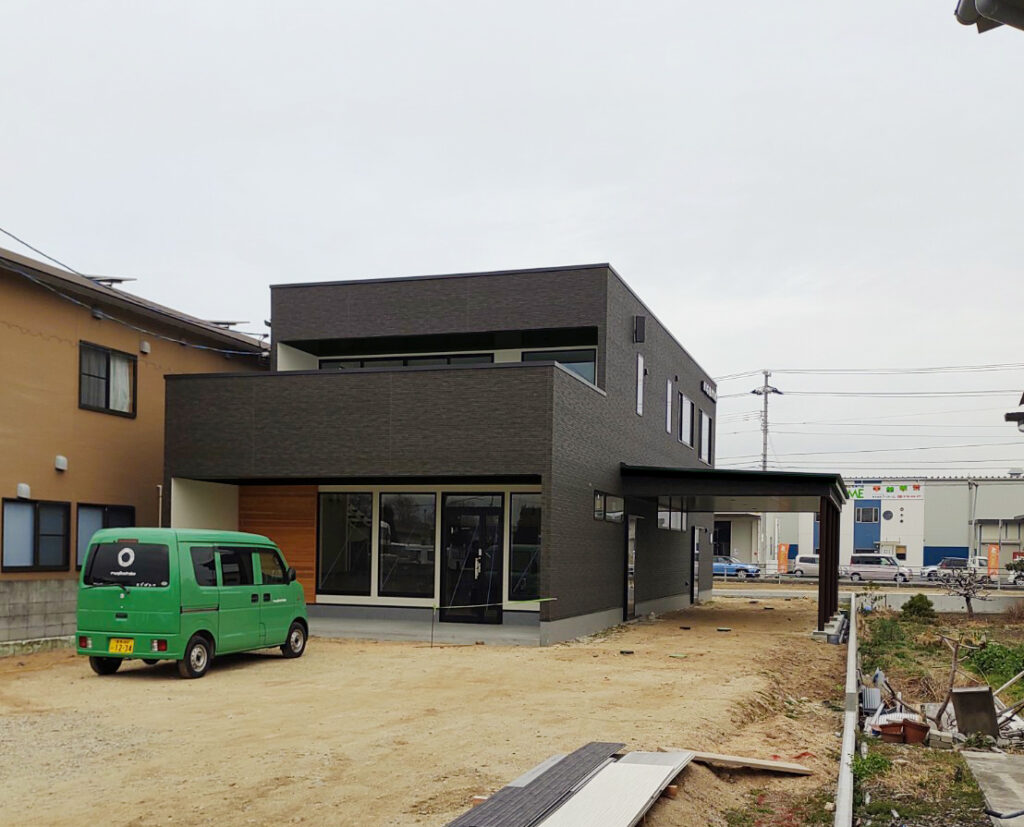 松山出張でしたので、東垣生の現場を見てきました。 エントランスの板張りがかわいい! ここに店舗サインが取り付けられます。耐力壁となっている部分です。 外壁の板張りも終わり、あとは塗装工事(鉄骨部)と店舗内家具、外構工事、…