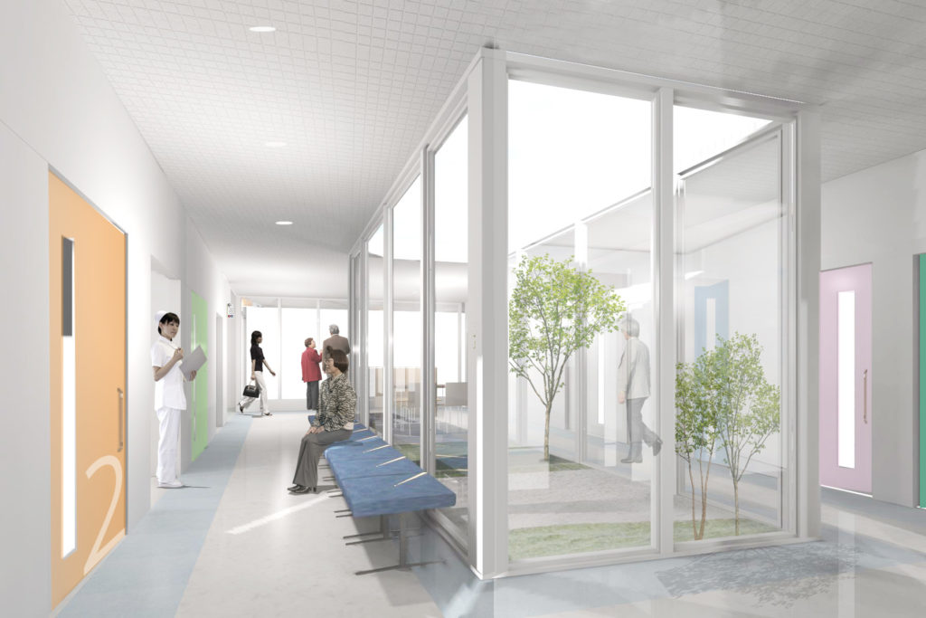 スリット状の細い光庭があるクリニックの新築工事の基本検討です。 中庭を中心とした回廊を計画し、診察室の待合空間を兼ねます。 中庭からのやわらかい光が、患者様の心を落ち着かせる空間となっています。扉は全て淡いパステルカラー…